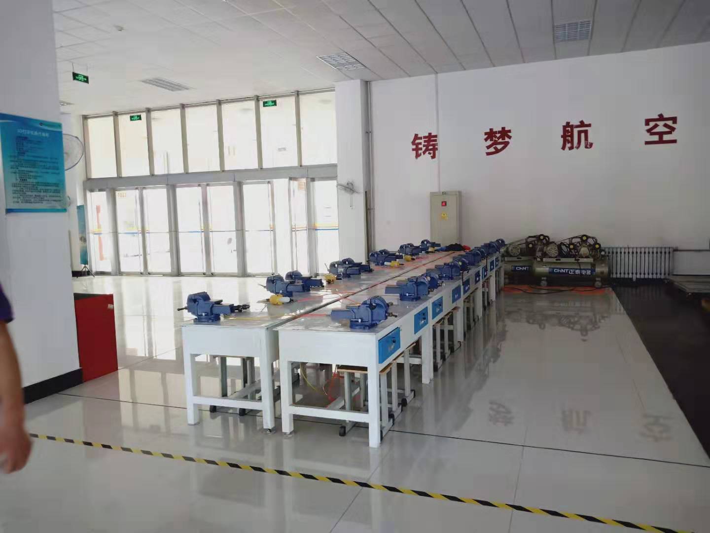 航空钣金铆接实验室,该实验室主要有智能制造实训系统、剪板机、卷圆机、折弯机、空压机、铆钉枪、气钻、钳工台、台虎钳等仪器设备,主要面向飞行器制造工程、飞行器设计与工程专业,开设《飞机钣金成型工艺》、《飞机装配工艺》、《飞机制造工艺实训》等课程,剪板机、弯板机、卷板机用来进行钣金、铆接工艺实训,可实现板材剪切下料、折弯、卷圆;空压机、钳工台、铆钉枪等设备用于飞机结构件铆接,可对结构件进行钻孔、铆接以及铆接表面处理等实验项目。